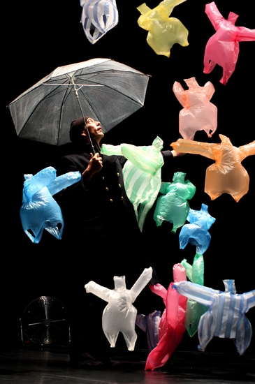 Sur le plateau, au son de trois œuvres musicales de Claude Debussy – L’après-midi d’un faune, Nocturnes et Dialogue du vent et de la mer – un·e maître·sse de ballet cerné·e de brasseurs d’air donne vie à une nuée de sacs plastique transformés en marionnettes qu’il·el fait monter, descendre, tourner, virevolter sous l’effet des courants de ce silencieux vortex.
