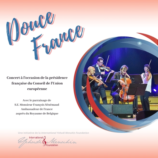 L’International Yehudi Menuhin Foundation organise le concert "Douce France" à l’occasion de la Présidence française du Conseil de l’Union européenne le mardi 21 juin 2022 à Wolubilis (Cours Paul-Henri Spaak 1, 1200 Bruxelles), avec le parrainage de S.E. Monsieur François Sénémaud Ambassadeur de France auprès du Royaume de Belgique. Depuis plus de trente ans, la Fondation réalise des projets socio-culturels visant à favoriser l’égalité des chances d’accès à la culture et à la pratique artistique. A travers ses concerts annuels, elle délivre un message de paix, d’universalisme, et de tolérance en célébrant les expressions musicales de diverses cultures.