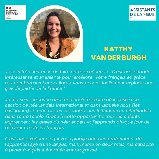 Katthy van der Burgh est l’une des assistantes de langue néerlandaise en France : elle a 21 ans, est diplômée d’un bachelier professionnel en Office Management avec une spécialisation en gestion des relations interculturelles de l'école supérieure Thomas More à Malines. Elle a effectué plusieurs stages dans des entreprises internationales et un séjour d’un mois de volontariat au Sri Lanka. Sportive, elle a entrainé des groupes de jeunes à la gymnastique.