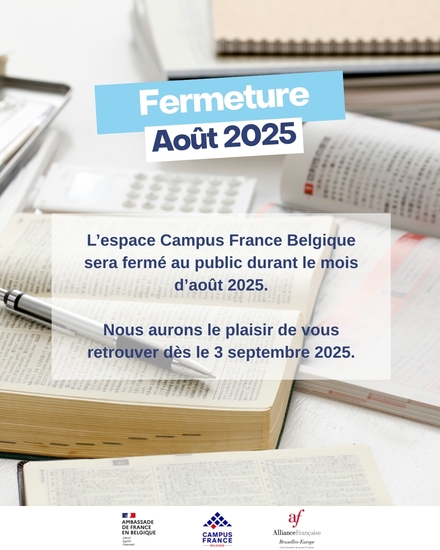 Nous vous informons que la permanence de Campus France Belgique située à l’Alliance Française Bruxelles-Europe sera fermée durant le mois d’août 2025.