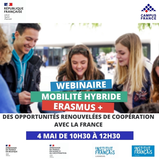 Tegen deze achtergrond hebben de Franse ambassades in België en Zwitserland, de Franse instituten in Nederland en Luxemburg op 4 mei 2021 een webinar georganiseerd over het thema hybride mobiliteit en het Erasmus+ programma 2021-2027.